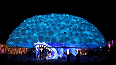 全球屈指可数的完整球幕影院,球幕内半空中架设廊桥,观众将爬上廊桥观看投影在整个球幕内侧的影片。