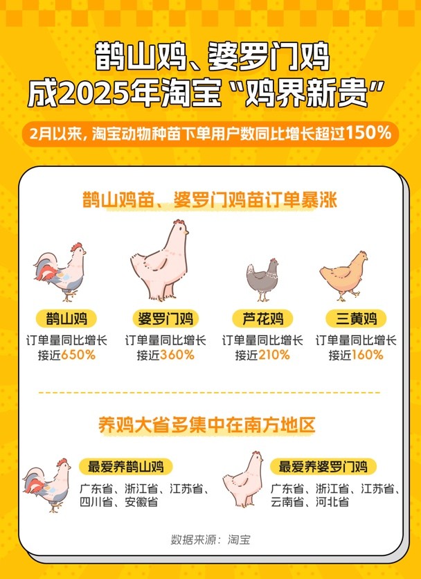 数据显示,2月以来,淘宝动物种苗下单用户数同比增长超过150%,其中鸡苗最为畅销。拥有五彩凤羽的鹊山鸡订单量同比暴涨接近650%,鸡中“海归精英”的婆罗门鸡订单量同比增长超过360%,大幅超越了传统芦花鸡、三黄鸡的订单增长。