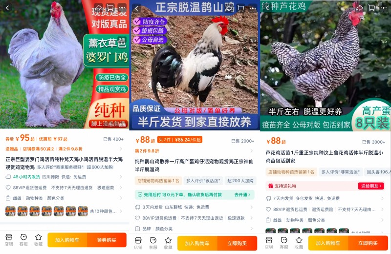 淘宝商家们用“腿上没毛包退”、“公母对版”、“疫苗齐全”等承诺来吸引用户